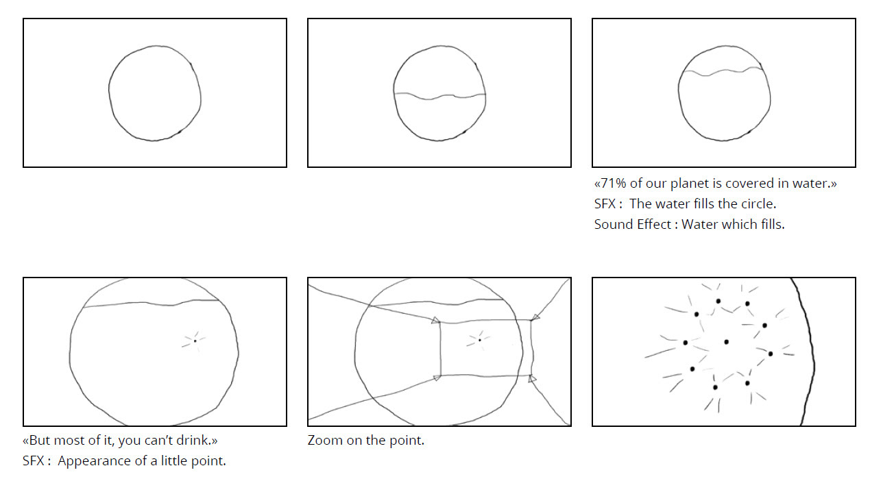 L'idée est de symboliser le manque d'eau potable sur Terre avec des icônes simples. L'ampoule étant le concept révolutionnaire, les dons étant la solution au problème.